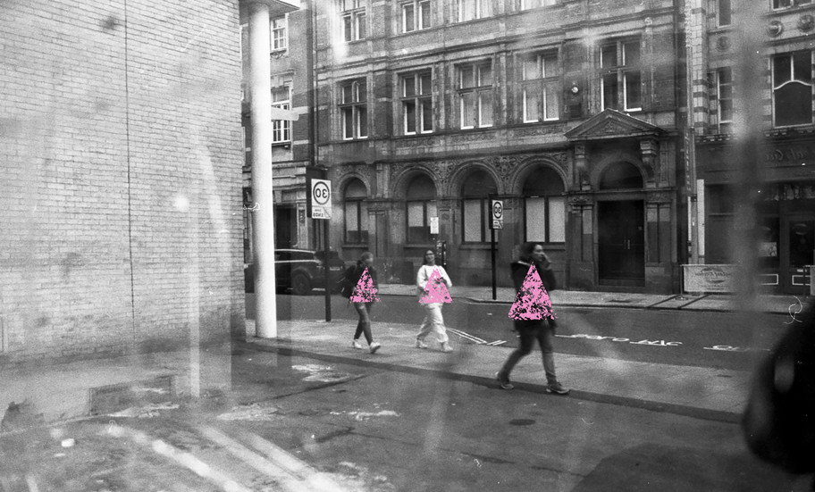 The original work was created in Southampton High Street during the run-up to Christmas when a great many people were busily shopping. After surveying the individuals in each of the photographs, I applied a blue or pink triangle over each of them, to correspond with my impression of their sex. In using the triangle as a stamp of gender recognition I intended to bring attention to the subconscious processes that we use to assess the sex of strangers.